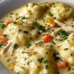 I’ll tell you straight: this is the kind of chicken and dumplings that hugs you back. Thick broth, pillowy dumplings, shredded chicken that isn’t shy about flavor — it’s the dish I reach for on evenings when the porch light’s on and the house smells like onions and something good is happening (I keep a jar of basil on the counter like it’s a lucky charm).