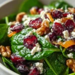 Toast the walnuts in a dry skillet over medium heat until fragrant (you’ll smell it before you see it) — it brings out a sweetness that plays wonderfully with the cranberries; also, if you dress the salad too early the spinach will wilt, so dress at the last minute unless you like your greens nicely glistening and slightly resigned.
