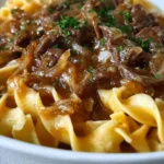 I grew up where supper was a serious affair and onions got their own weather reports — caramelized, syrupy, and worth the fuss. French Onion Beef and Noodles is basically that cozy Sunday-pot-luck energy but faster, with beef that’s been browned up and onions that turn into pure comfort (they smell like porch lights and Saturday church suppers). Small-town truth: a good pan of onions will make people forget they were hangry five minutes ago.