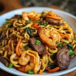 I like a weeknight recipe that comes together fast and feels like you didn’t skimp on dinner (even if you did — we all have those nights). This Steak & Shrimp Stir-Fried Noodles is the kind of dish that makes the house smell like something I’d order out but whisper to myself, “I made that,” and then act modest about it. The sear on the steak, the snap of bell pepper, the quick pop of shrimp — it’s all comfort with a little bit of sass (and yes, I’ll admit I sometimes grab the green onions from the farm stand off Highway 19 because they look happier).